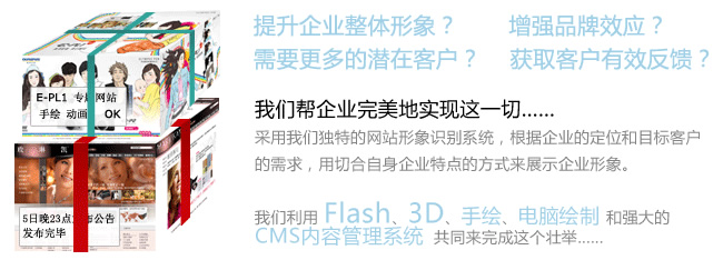 FLASH相信您已不再陌生,我们知道用Flash能制作出精美的动画,Flash在互联网的应用已经无 处不在了,也就是他已经和商业紧密的结合,您想让您的公司、您的产品在短短的几秒钟给您的顾客深刻的印象吗?您想让您的企业在互联网上有一个超炫的站点,以提高您网站的浏览率吗? Flash动画能够助您一臂之力,我们拥有一支顶尖的专业Flash设计师队伍,为您提供专业的 Flash动画设计。
